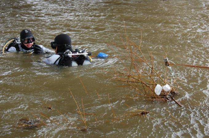 Nurkowie, niezniechęceni warunkami pogodowymi, przez kilkadziesiąt minut przeszukiwali dno rzeki. Poszukiwania były dodatkowo utrudnione ze względu na wysoki poziom wody i silny nurt w Wiśle. Mimo to nurkowie zdołali zlokalizować pokłady odpadów budowlanych zalegających na dnie (gruz, metalowe pręty). Niestety, ze względu na wielkość, nie udało się ich wydobyć z wody.