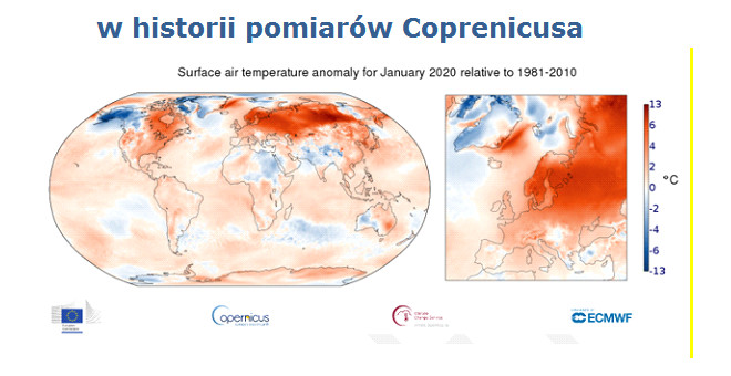 Według Copernicus Climate Change Service ostatni miesiąc był najgorętszym styczniem w Europie w historii pomiarów meteorologiznych. Temperatury powierzchni były o 3,1 stopnia Celsjusza wyższe niż przeciętnie i były o 0,2 stopnia Celsjusza wyższe niż w dotychczasowym, rekordowym styczniu w 2007 roku.