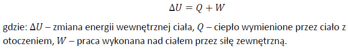 Zgodnie z założeniami I zasady termodynamiki zmiana energii wewnętrznej danego ciała jest równa sumie pracy wykonanej nad tym ciałem przez siłę zewnętrzną oraz ciepła wymienionego przez ciało z otoczeniem:
