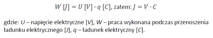 - pracy wykonanej przeciwko polu elektrycznemu podczas przenoszenia ładunku elektrycznego o wartości 1 kulomba (C) między punktami o różnicy potencjału elektrycznego wynoszącej 1 wolt (V) zgodnie z poniższą zależnością: