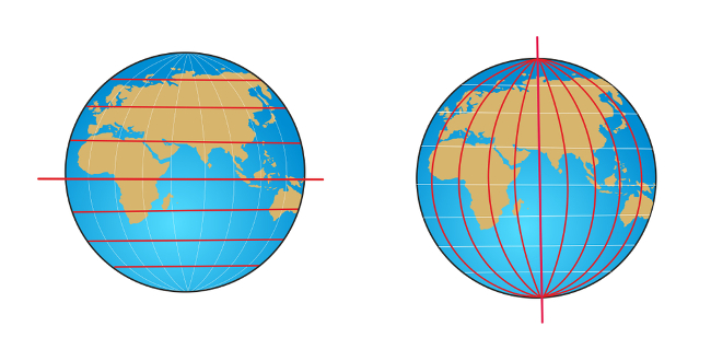 Układ współrzędnych geograficznych stanowi siatkę geograficzną złożoną z nieskończenie wielu biegnących prostopadle względem siebie południków i równoleżników geograficznych. Południki, zwane półokręgami długości geograficznej, są umownymi liniami wyznaczonymi na powierzchni Ziemi, cechującymi się jednakową długością (ok. 20 tys. km), zbiegającymi się w biegunach i łączącymi punkty o tej samej długości geograficznej. Południki wyznaczają kierunek północny i południowy; południk 0° (południk zerowy) i południk 180° (linia zmiana daty) dzielą kulę ziemską na półkulę wschodnią (E) i zachodnią (W). Równoleżniki, określane również mianem okręgów szerokości geograficznej, są umownymi liniami na powierzchni kuli ziemskiej łączącymi punkty o tej samej szerokości geograficznej. Linie te wyznaczają kierunek wschodni i zachodni; cechują się zmienną długością, wzrastającą wraz z oddalaniem się od biegunów. Najdłuższym równoleżnikiem jest równik o długości ok. 40,075 tys. km, dzielący kulę ziemską na półkulę północną (N) i południową (S). Ważnymi równoleżnikami są również zwrotniki i koła podbiegunowe, o szerokościach geograficznych ściśle związanych z kątem nachylenia osi obrotu Ziemi i płaszczyzny równika do płaszczyzny orbity ziemskiej. Zwrotniki Raka (ok. 23°27’N) i Koziorożca (ok. 23°27’S) oraz koła podbiegunowe północne (ok. 66°33’N) i południowe (ok. 66°33’S) stanowią granicę pięciu stref oświetlenia Ziemi – strefy tropikalnej (międzyzwrotnikowej), dwóch stref umiarkowanych (leżących między zwrotnikami i kołami podbiegunowymi) i dwóch stref podbiegunowych (leżących między kołami podbiegunowymi i biegunami).