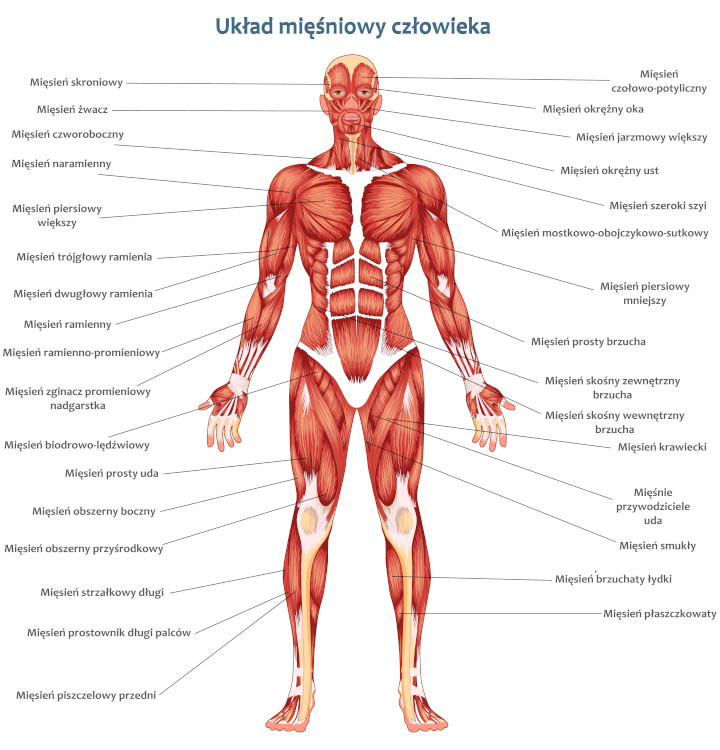 Układ mięśniowy tworzą zróżnicowane mięśnie biorąc pod uwagę różne kryteria ich podziału. Do takich kryteriów należy ich czynność, liczba głów, budowa jak również położenie. W zależności od położenia (pod względem topograficznym) wyróżnia się mięśnie: głowy i szyi, tułowia i brzucha, kończyny górnej, kończyny dolnej, klatki piersiowej oraz mięśnie grzbietu.
