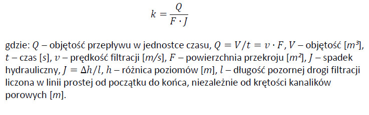 Współczynnik filtracji (k) można wyrazić zatem z wykorzystaniem następującego wzoru: