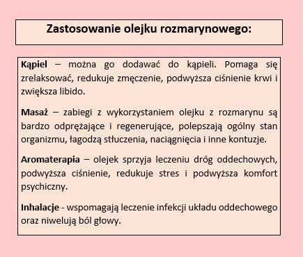 Stosuję dość często olejek rozmarynowy, szczególnie jak czuję, że zbliża się katar. Smaruję klatkę piersiową kremem, a potem wmasowuję ze 3 krople olejku. O wiele łatwiej walczy się z przeziębieniem. Czasami do płukania ust, kiedy np uparzę się jedzeniem, to szybciej się goi. Czasami też na ból kręgosłupa w połączeniu z maścią z konopi. Moim zdaniem działa tak samo jak leki przeciwbólowe, a nie ma skutków ubocznych (mam nadzieję). Stosuję już kilka lat i nie zauważyłam. Ciśnienie mam niskie