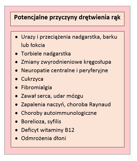 Najczęstszą przyczyną drętwienia ręki jest podrażnienie, ucisk lub uszkodzenie jednego z nerwów przewodzących sygnały do dłoni i palców. Sytuacja taka pojawia się stosunkowo często jako wynik nagłych urazów lub chronicznego przeciążenia. Można też powiedzieć, że jest to najlepszy z możliwych wariantów, który zazwyczaj daje dobre rokowania na przyszłość.