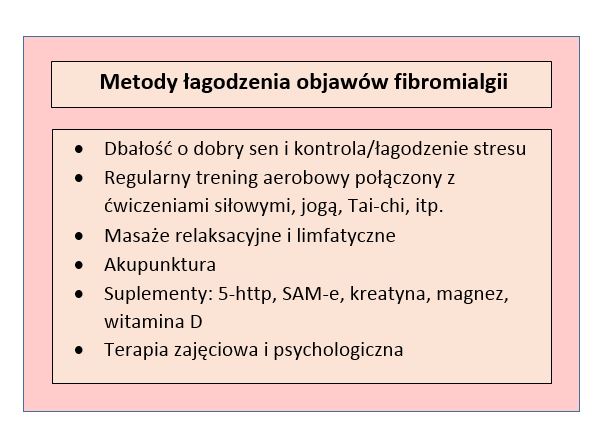 Lekarze wskazują również, że bardzo ważne jest znalezienie równowagi między aktywnością a odpoczynkiem – niewskazana jest przesada w żadną stronę! Wszelki postęp powinien być dokonywany w bardzo długim okresie czasu, bez drastycznych zmian czy zmuszania się do zbyt intensywnego wysiłku. Ponadto w naturalnym łagodzeniu objawów fibromialgii skuteczna okazuje się akupunktura wykonywana przez doświadczonego specjalistę, jak również stymulujący masaż tkliwych punktów.