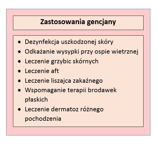 Roztwór gencjany wskazany jest wyłącznie do użytku zewnętrznego i oficjalnie stanowi lek na grzybiczne i bakteryjne infekcje skórne, zakażone rany, a także prewencję chorób dermatologicznych wywołanych wspomnianymi drobnoustrojami. Ma on ponadto właściwości wysuszające i lekko ściągające. Charakterystycznym rysem gencjany jest fakt, że najlepiej działa ona w środowisku zasadowym.