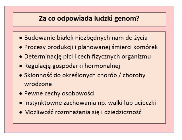 Podsumowując więc, genom umożliwia naszemu organizmowi rozwój od pojedynczej zapłodnionej komórki po dorosłego człowieka, przeżycie z dnia na dzień, a także rozmnażanie się. Poznawszy genom możemy więc bardziej świadomie kształtować nasze życie na Ziemi. Tutaj warto jednak dodać, że geny nie decydują o wszystkim – z badań przeprowadzonych na bliźniętach jednojajowych wynika, że zachowanie, osobowość czy inteligencja jednostki nawet w 70% kształtowane są jednak przez otoczenie!