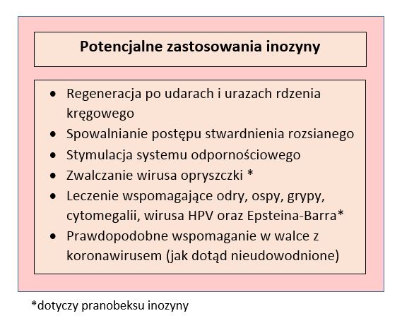 Najczęstszym zastosowaniem inozyny było dotychczas szpitalne leczenie rzadkich komplikacji odry w postaci stanu zapalnego mózgu. Preparat pojawił się jednak również w wolnej sprzedaży w aptekach jako wsparcie w walce z opryszczką ludzką (Herpes), zarówno przejawiającą się w postaci zmian wokół ust, jak i brodawek na genitaliach. Obecnie sprzedawany jest w wolnym obiegu w ponad 70 krajach świata jako lek przeciwwirusowy zwalczający nie tylko opryszczkę, ale również ospę, odrę, cytomegalię, wirus brodawczaka ludzkiego (HPV), wirus Epsteina-Barra oraz pospolite wirusy powodujące klasyczne infekcje górnych dróg oddechowych (Sliva i in., 2019). W każdym z tych przypadków chodzi o pobudzanie układu odpornościowego do walki z wirusami, raczej niż ich rzeczywiste zwalczanie.