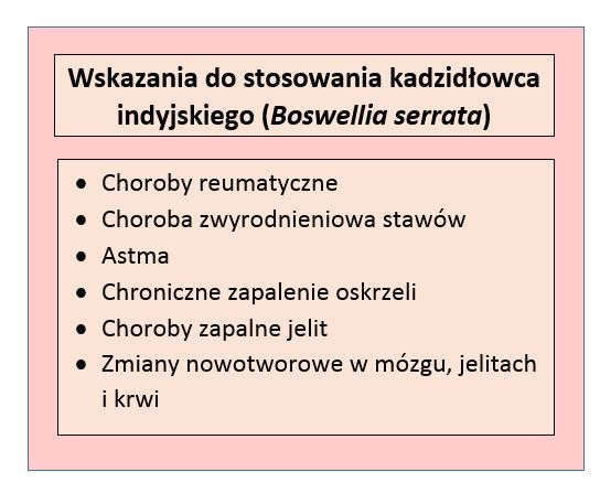 Działanie to ma szczególnie istotne zastosowanie przy leczeniu chorób o podłożu reumatycznym, w tym reumatoidalnego zapalenia stawów, jak również schorzeń artretycznych, w tym choroby zwyrodnieniowej stawów. Bardzo obiecujące są na przykład rezultaty suplementacji kadzidłowcem przez problemach związanych z degeneracją stawu kolanowego. Z ciekawego eksperymentu prowadzonego na ochotnikach samodzielnie zadających sobie ból (Prabhavathi, 2014) wynika ponadto, że Boswellia serrata znacząco zwiększa próg tolerancji na ból i ogranicza stopień jego odczuwania!