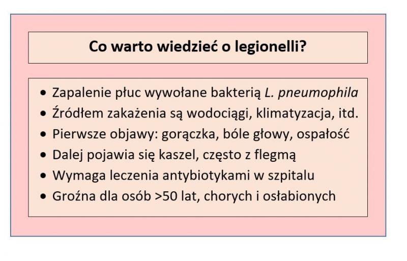 Warto wiedzieć: L. pneumophila oraz inne szczepy tej samej bakterii mogą wywoływać również legionellozę bez zapalenia płuc, zwaną gorączką Pontiac. Ma ona łagodniejszy przebieg i przypomina klasyczną grypę. Objawy pojawiają się po 1-3 dniach od zakażenia, którego źródłem może być nawet ziemia doniczkowa. Zazwyczaj ustępują jednak samoistnie w przeciągu tygodnia. Ta forma infekcji nie jest wiązana z zagrożeniem dla życia.