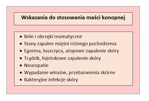Ponadto maść konopna polecana jest na szereg powszechnych problemów dermatologicznych. Uważa się, że hamuje ona nadmierne wydzielanie łoju, przyspiesza złuszczanie martwych komórek naskórka, a także działa przeciwbakteryjnie i łagodzi stany zapalne skóry. Stąd też może być stosowana w leczeniu trądziku, łuszczycy i egzemy, a także świądu różnego pochodzenia, atopowego zapalenia skóry, przebarwień związanych z nadmiarem lub niedostatkiem pigmentu, a nawet wypadania włosów. Co ciekawe, kannabioidy wydają się także skutecznie zwalczać gronkowca złocistego odpornego na metycylinę (MRSA) oraz szereg innych bakterii i z tego względu są uważane za alternatywę dla lokalnych antybiotyków przepisywanych ma infekcje dermatologiczne.
