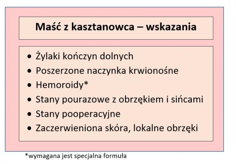 Głównym zastosowaniem maści z kasztanowca jest więc leczenie żylaków. Aplikowana bezpośrednio na skórę podudzi poprawia krążenie oraz wzmacnia i uelastycznia ściany naczyń, redukując takie objawy niewydolności żylnej kończyn dolnych jak obrzęk, świąd, ból, uczucie zmęczenia i napięcia, zasinienie, a także widoczne wybrzuszenia nadmiernie poszerzonych żył. Najlepsze efekty daje przy tym połączenie doustnej terapii wyciągiem z kasztanowca z lokalnym masażem z pomocą maści.