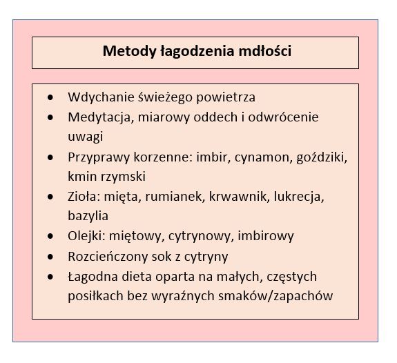 Ponadto bardzo dobre skutki w leczeniu mdłości różnego pochodzenia, nawet tych towarzyszących ciąży, przynosi imbir. Można żuć surowy korzeń, pić herbatę z niego lub przyjmować suplement ze sproszkowanego korzenia. Imbir w racjonalnych ilościach nie wywołuje skutków ubocznych, a ponadto wydaje się również ograniczać wymioty. Podobne właściwości mają zresztą cynamon, goździki oraz kmin rzymski. Popularnością cieszą się również pospolite zioła, takie jak mięta i rumianek. Olejek eteryczny z mięty w formie inhalacji doskonale łagodzi mdłości pooperacyjne, zaś wystudzony napar z rumianku łagodzi dyskomfort w przypadku dolegliwości gastrycznych. Z ziół poleca się również świeżą bazylię, korzeń lukrecji oraz ziele krwawnika.