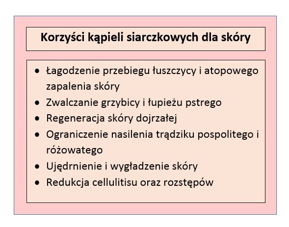 Oprócz siarkowodoru głęboko penetrującego tkanki ciała, istotne działanie powierzchniowe w kontekście kąpieli siarczkowych odgrywają również jony siarkowe oraz siarka koloidalna. Łącznie te trzy typy siarki pełnią łagodzącą rolę także w kontekście zaburzeń dermatologicznych o podłożu immunologicznym, takich jak łuszczyca, egzema, kontaktowe zapalenie skóry oraz atopowe zapalanie skóry. Zdaniem naukowców niektóre wody mineralne o wysokiej zawartości siarki powodują wręcz wzrost beta-endorfin w ludzkiej skórze, a ponadto mogą zapobiegać wielu zaburzeniom dermatologicznym związanym z procesem starzenia. Siarkowodór reguluje również cykl życia komórek skóry, zwiększając poziom przeżycia zdrowych komórek, a tym samym posiada wpływ regenerujący i ujędrniający, co może przekładać się na efekt optycznego „odmłodzenia”.