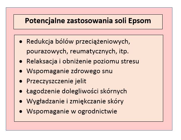 Poza tym sól Epsom ma łagodzić bóle spowodowane nadmiernym przeciążeniem mięśni, jak również skurcze wynikające z niedostatku magnezu. Sceptycy wskazują, że faktyczna poprawa dolegliwości fizycznych po kąpieli w siarczanie magnezu może jednak raczej być wynikiem relaksującego działania ciepłej wody niż niekoniecznie wchłanianych jonów. Warto wszak dodać, że pojedyncze studia naukowe (Engen i in., 2015) przeprowadzone co prawda na niewielką skalę wskazują, że aplikowanie soli Epsom na skórę kończyn górnych i dolnych może przynosić korzyści w przebiegu fibromialgii. Podobne korzyści sugeruje się w przypadku schorzeń reumatologicznych przebiegających z bólem i opuchlizną stawów, migreny, łuszczycy lub egzemy, zmęczonych, opuchniętych nóg, a także sińców i bólów pourazowych, typu zwichnięcia. Kąpiele stóp pomagają z kolei przy problemie wrastających paznokci, zgrubiałym naskórku, jak również przykrym zapachu. Zwolennicy medycyny integracyjnej polecają sól Epsom także w przypadku chronicznego zmęczenia i zwiększonego ryzyka kardiologicznego, zaś w wielu domach brytyjskich kąpiel w soli Epsom ma być dobra na wszystko!