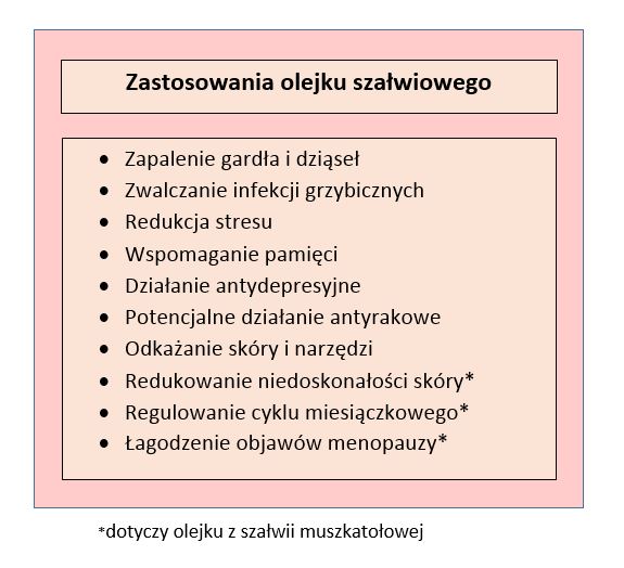 Olejek z szałwii muszkatołowej z kolei polecany jest od wieków przede wszystkim kobietom jako środek regulujący gospodarkę hormonalną. Może on być przydatny przy zaburzeniach cyklu, bolesnym miesiączkowaniu, depresji związanej ze zmianami poziomu hormonów (Mahboubi, 2020). Pomaga także kontrolować produkcję sebum, dzięki czemu może być stosowany powierzchniowo do walki z takimi problemami jak trądzik czy cellulitis (Baratta, 1998). Poleca się również stosować go na skórę podrażnioną i przesuszoną, jak również nadmiernie potliwe okolice pach czy stopy. Olejek szałwiowy może być wręcz naturalnym dezodorantem chroniącym przed poceniem!