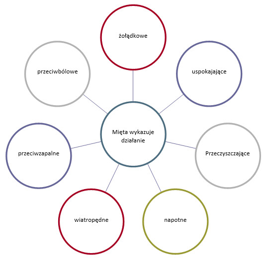 Głównym czynnym biologicznie składnikiem mięty jest olejek miętowy, który powstaje poprzez destylację ziela i liści z parą wodną. Olejek z mięty pieprzowej ma bardzo intensywny i orzeźwiający zapach ‒ wykazuje właściwości chłodząco-znieczulające na skórę i błony śluzowe. Działa rozkurczowo, antyseptycznie i przeciwbólowo, dlatego jest jednym z najczęściej stosowanych i najbardziej wszechstronnie działających olejków leczniczych.