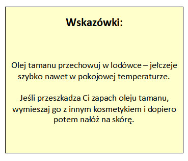 A efekt każdorazowego użycia oleju tamanu jest niestety właśnie taki, że roztaczamy wokół siebie woń domowego obiadu. Intensywność tego aromatu da się zmniejszyć, mieszając olej tamanu z innym kosmetykiem oraz łącząc go z olejkami eterycznymi. Po dłuższym stosowaniu można się zresztą przyzwyczaić. Jeśli testowanie oleju dopiero przed nami, wiedzmy, że najlepiej nakładać go punktowo, na poszczególne zmiany skórne. Ponieważ olej tamanu bardzo dobrze nawilża, wygładza i odbudowuje, warto też stosować go na całe partie skóry, zmniejszając jednak jego stężenie do 10-50%. Kilka razy w tygodniu dodajmy go do ulubionego kremu nawilżającego lub serum i wetrzyjmy w twarz. Taki zabieg pomoże zwłaszcza suchej, zmęczonej, zanieczyszczonej oraz szarej cerze, ze skłonnością do zaskórników i pryszczy. Olejek mieszajmy z kosmetykami w dłoniach, zaraz przed nałożeniem na skórę. Zadowalające efekty otrzymamy rozcieńczając olej tamanu w żelu hialuronowym lub w hydrolacie.