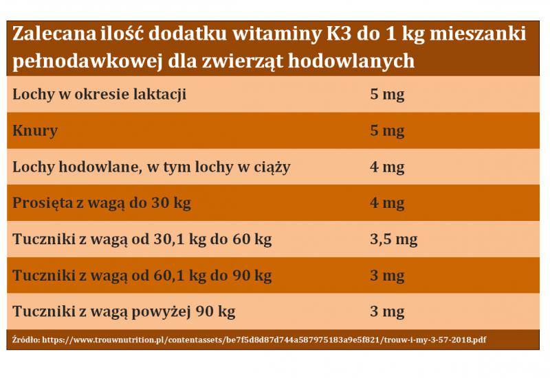 Zapotrzebowanie na witaminę K3 u zwierzęcia uzależnione jest od wielu czynników, takich jak np. masa ciała, wiek i stan fizjologiczny. Poniższa tabelka przedstawia zalecane dawki, które należy dodawać do jedzenia zwierząt hodowlanych.