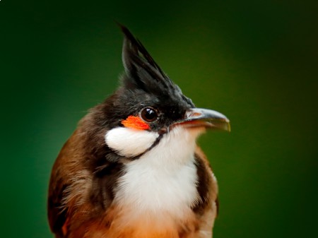 Tęczówki oczne ciemnobrązowe. Dziób stosunkowo cienki i czarny. Na ciemieniu długi, czarny, spiczasty czub. Czoło, ciemię, potylica, kark, okolice nasady dziob, kantarek oraz brew są czarne. Charakterystyczne czerwone plamy ciągnące się od spodu oka do pokryw usznych. Policzki białe z czarnym wąsem. Ciemnobrązowy kołnierz na piersi. Podgardle, gardło i pierś białe. Wierzch szarobrązowy. Spód biały. Czerwonawe podogonie. Dosyć długi, brązowy ogon, z białym zakończeniem. Krótkie, ciemne nogi. Brak dymorfizmu płciowego. Osobniki młodociane przypominają dorosłe, rozróżnić je można po braku czerwonych plam na głowie.