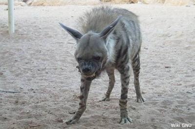 Hiena pręgowana – długość ciała tej hieny wynosi 95 -120 cm, długość ogona ok. 30 cm, wysokość w kłębie 65 -80 cm, waga 25 -45 kg. Zwierzę to ma charakterystyczną sylwetkę z tylnymi kończynami krótszymi od przednich i grzbietem wyraźnie opadającym ku tyłowi. Szczęki i zęby są potężne, uszy dość długie i stojące. Jej szorstkie futro tworzy wzdłuż kręgosłupa obfitą grzywę. Ubarwienie jest szare lub żółtobrązowe, po bokach ciała widnieją pionowe pręgi w kolorze ciemnobrązowym lub czarnym. Na nogach paski są poziome.