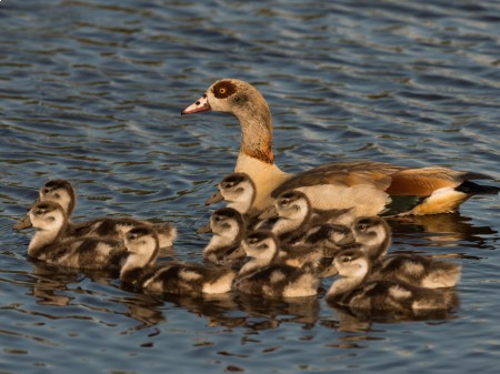 Gatunek monogamiczny. Gnieździ się na ziemi, na półce skalnej, w dziupli w drzewie, zajmuje także opuszczone gniazda innych ptaków. Gniazdo buduje z materiałów roślinnych i wyściela je puchem. Jeden lęg w roku. Samica składa od 5 do 12 jasnych jaj. Czas wysiadywania (przez oboje rodziców) wynosi niecały miesiąc. Dojrzałość płciową osiąga w drugim roku życia.
