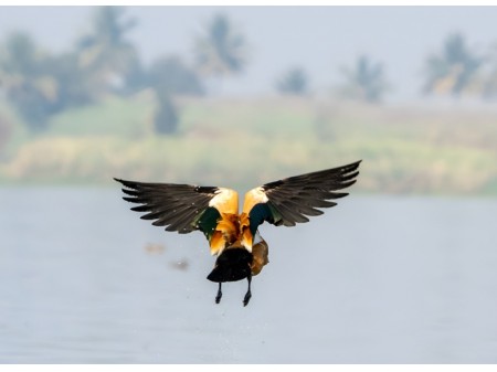 Głowa oraz górna część szyi cynamonowo-płowe. Tęczówki ciemne. Ciemny dziób, z wklęsłym grzbietem. Szyja dosyć długa. Wierzch, dolna część szyi, pierś oraz spód rdzawobrązowe. Skrzydła długie z czarnymi lotkami, o metaliczno zielonym połysku. Część wierzchnia oraz spodnia pokryw skrzydeł białe, przy złożonych skrzydłach widoczna tylko mała biała wstawka. Kuper oraz ogon czarne. Mocne, długie, ciemne nogi. Dymorfizm płciowy nieznaczny, samice są nieco mniejsze. U samców w okresie letnim występuje czarna obroża na szyi. Białe rozjaśnienie na wysokości oka. Wierzch oraz spód nieco ciemniejsze. Skrzydła gładkie. Samice mają wyraźniejszą białą maskę (obejmującą czoło, obszar za okiem do podbródka). Na pokrywach delikatne łuskowanie. Osobniki młodociane podobne do samic, pokrywy skrzydeł z szarawym nalotem.