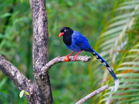 Kitta modra należy do rodziny krukowate (Corvidae). Ubarwienie wierzchu i spodu jest szafirowo niebieskie. Głowa, szyja, pierś są czarne. Dziób i nogi są koralowo czerwone. Tęczówka oczna jest żółta. Ogon jest bardzo długi, z białym końcem. Ubarwienie obu płci jest podobne.