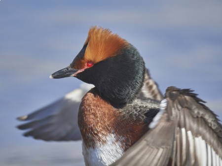 Płaska głowa. Dziób prosty, stosunkowo krótki, z jasnym koniuszkiem. Tęczówka oka jaskrawoczerwona (jak u zausznika). Ciało, szyja długawe. Na palcach ma płaty skórne. Dorosłe w szacie godowej oraz spoczynkowej mylone z zausznikiem przez podobne ubarwienie. W lecie odróżnialne po rdzawej szyi oraz po kształcie głowy. Obie płcie ubarwione tak samo. W okresie godowym szyja i boki są rdzawe, a wierzch, ciemię oraz pokrywy uszne ciemne, brzuch biały. Charakterystyczne pęki żółtych piór ciągnące się wzdłuż brwi, sięgając do karku. Kantarek rozjaśniony. W zimie skromniej ubarwione, ciemię oraz brew ciemne, kontrastujące z białymi policzkami (na końcu głowy – ciemnej czapeczki białe wcięcie). Wzdłuż karku cienka czarna linia. Delikatna plamka na kantarku, Na szyi jasnoszara obroża (jak u zausznika). Osobniki młodociane dosyć podobne do dorosłych, na policzku szarawy pasek, nie mają białego wcięcia na ciemnej czapeczce. Jasna plamka na kantarku jest nieco większa.