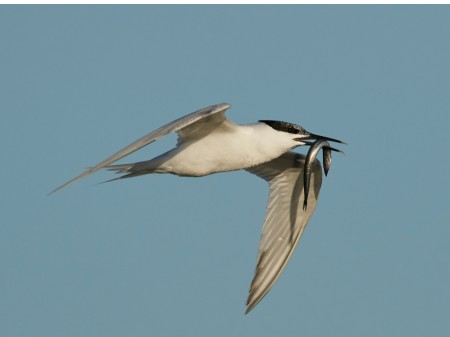 Żywi się głównie pokarmem zwierzęcym, zarówno, choć w przewadze, kręgowcami (małymi rybami) jak i bezkręgowcami (skorupiakami). Pokarm zdobywa wypatrując zdobycz w locie, a następnie pikując za nią do wody.