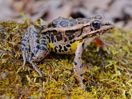 Żaba błotna to średniej wielkości żaba o budowie typowej dla przedstawicieli rodziny żabowatych (Ranidae). Jest jednym z kilkunastu trudnych do odróżnienia od siebie północnoamerykańskich gatunków, łącznie określanych jako “żaby lamparcie”. Wszystkie prowadzą półwodny tryb życia i mają bardzo zmienne ubarwienie, zazwyczaj jednak z wyraźnymi, regularnymi ciemnymi plamami na wierzchu ciała (stąd nazwa). Gatunek nie jest zagrożony ze względu na duży zasięg geograficzny; mimo to, podobnie jak w przypadku większości płazów, lokalnie występują znaczące spadki populacji ze względu na niszczenie siedlisk i śmiertelność z powodu ruchu drogowego.