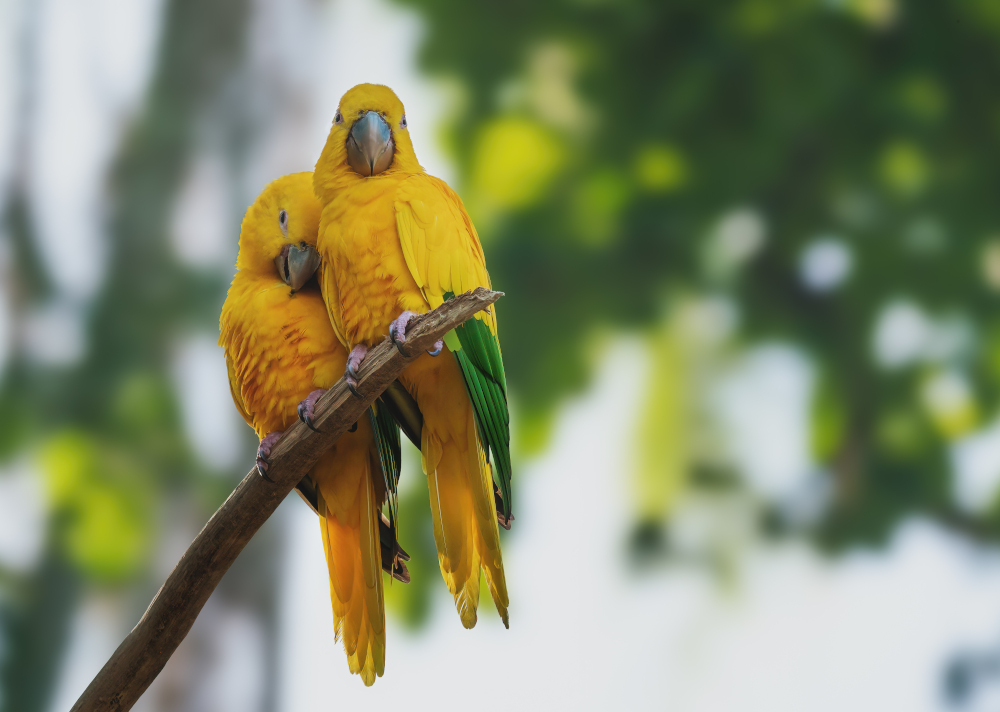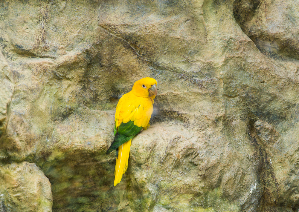 - Upierzenie: dominujący kolor żółtozłoty. Lotki i pióra skrzydeł mają barwę zieloną, co stanowi kontrast względem żółtej reszty ciała. Obszar wokół oczu jest jasnoróżowy. Nogi również mają odcień różowawy.